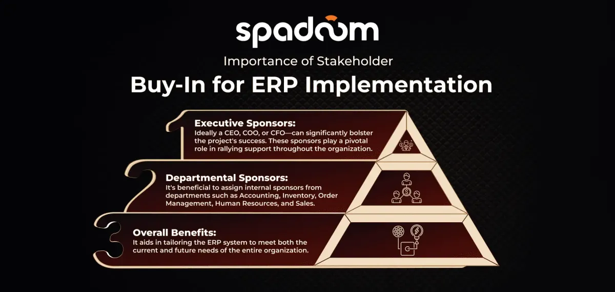 Ottenere il consenso dei principali stakeholder è fondamentale per un’implementazione ERP di successo, poiché influisce su molteplici aspetti dell’organizzazione. È vitale conquistare il supporto esecutivo, poiché l’ERP ha un impatto su vari aspetti organizzativi. Mettete in evidenza i potenziali vantaggi del sistema, come quelli offerti da SAP ERP, per ottenere questo supporto. Nominare un executive sponsor — idealmente un CEO, COO o CFO — può rafforzare significativamente il successo del progetto. Questi sponsor svolgono un ruolo fondamentale nel raccogliere il supporto all’interno dell’organizzazione.
